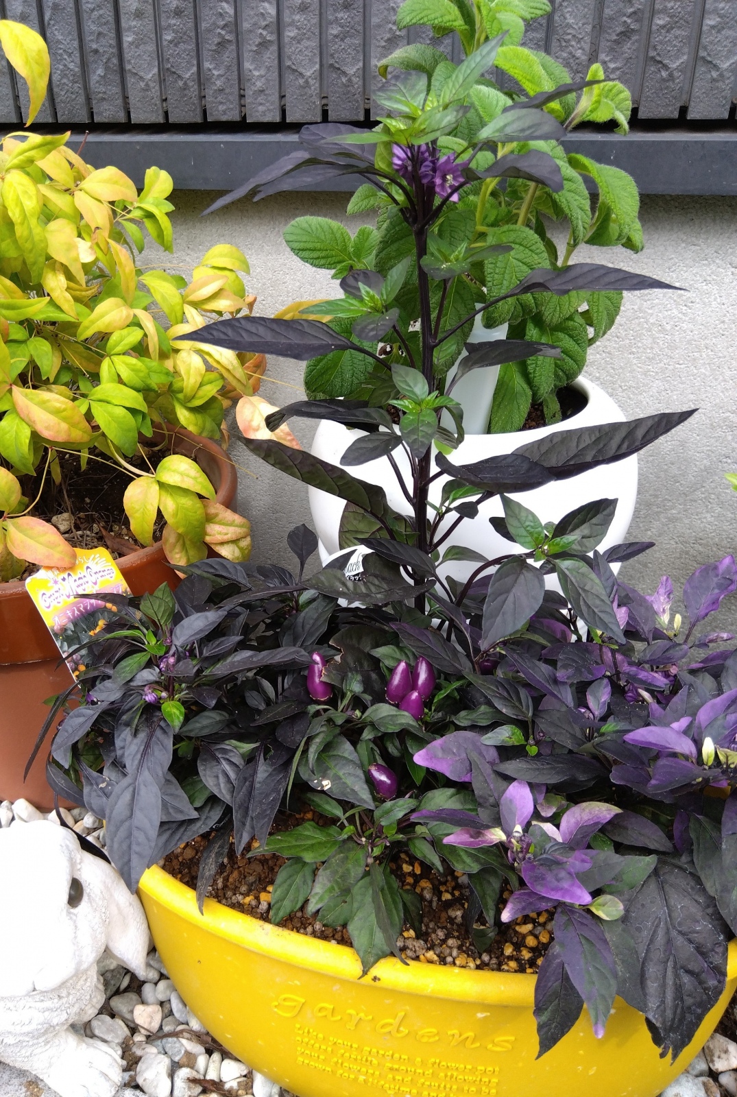 黄色い鉢に黒でまとめてみました。本当は夏前くらいに植えるもの(笑)