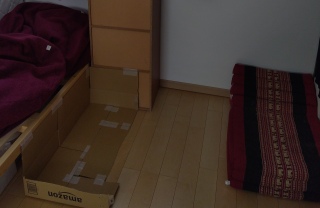お気に入りのマットレス(右のエンジ)とアマゾンの段ボールで作った食事するスペース。
